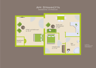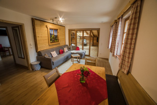 Großzügiges Appartement für 2 - 6 Personen ist bäuerlich exklusiv und großzügig eingerichtet. Es besteht aus einem Schlafzimmer, einem Schlafzimmer mit Wohnbereich, einem großzügigen barrierefreien und behindertengerechten Bad und einer Küche mit Essbereich und Wohnraum mit Schlaf-Ausziehcouch.